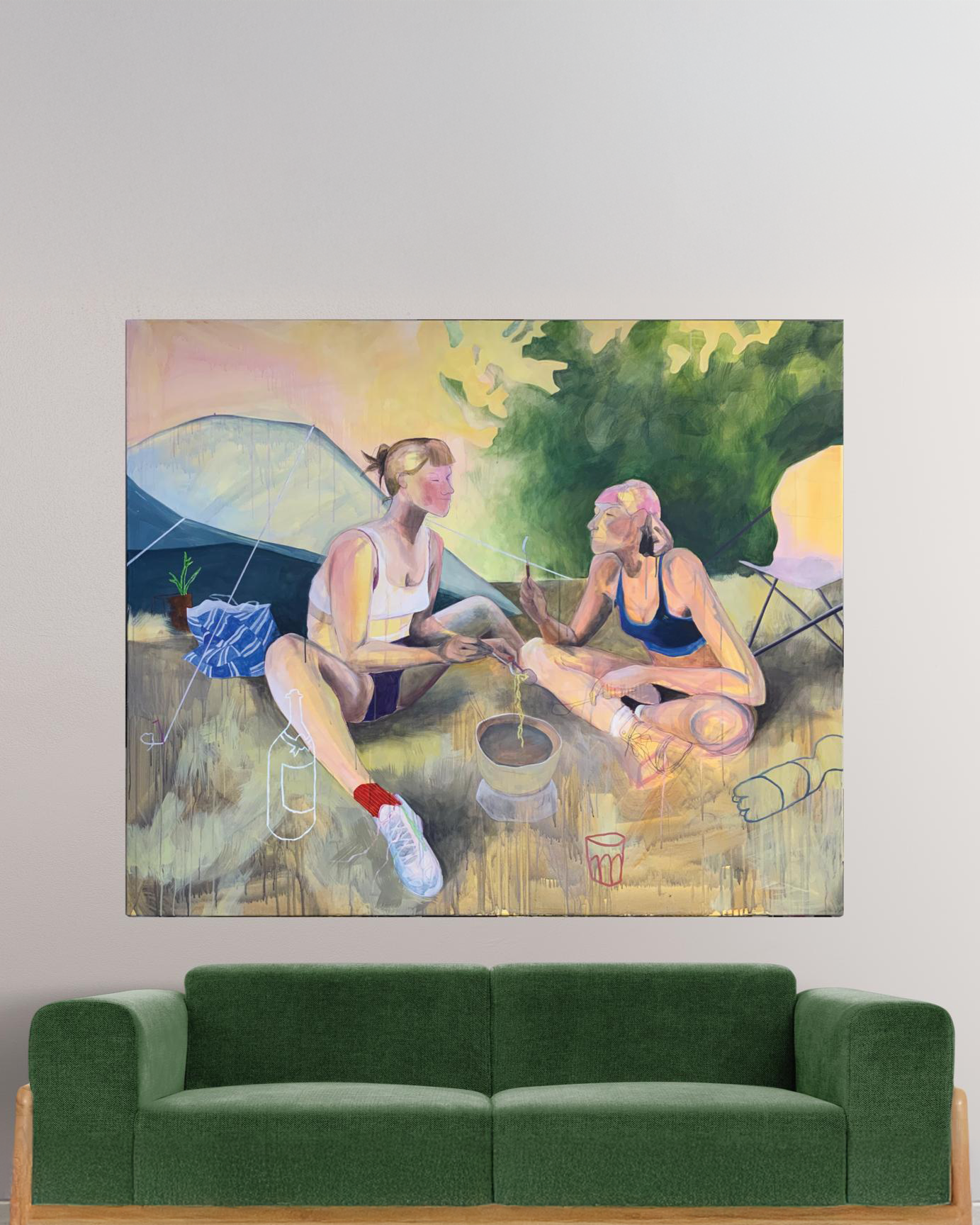 „noudle soup“ trägt sommerliche hitze, staubige luft und die leichtigkeit eines festivals in sich. das werk zeigt einen vertrauten moment zwischen zwei freundinnen, gelöst und ganz bei sich. körper, die einfach da sein dürfen, die raum einnehmen, ohne etwas zu müssen.